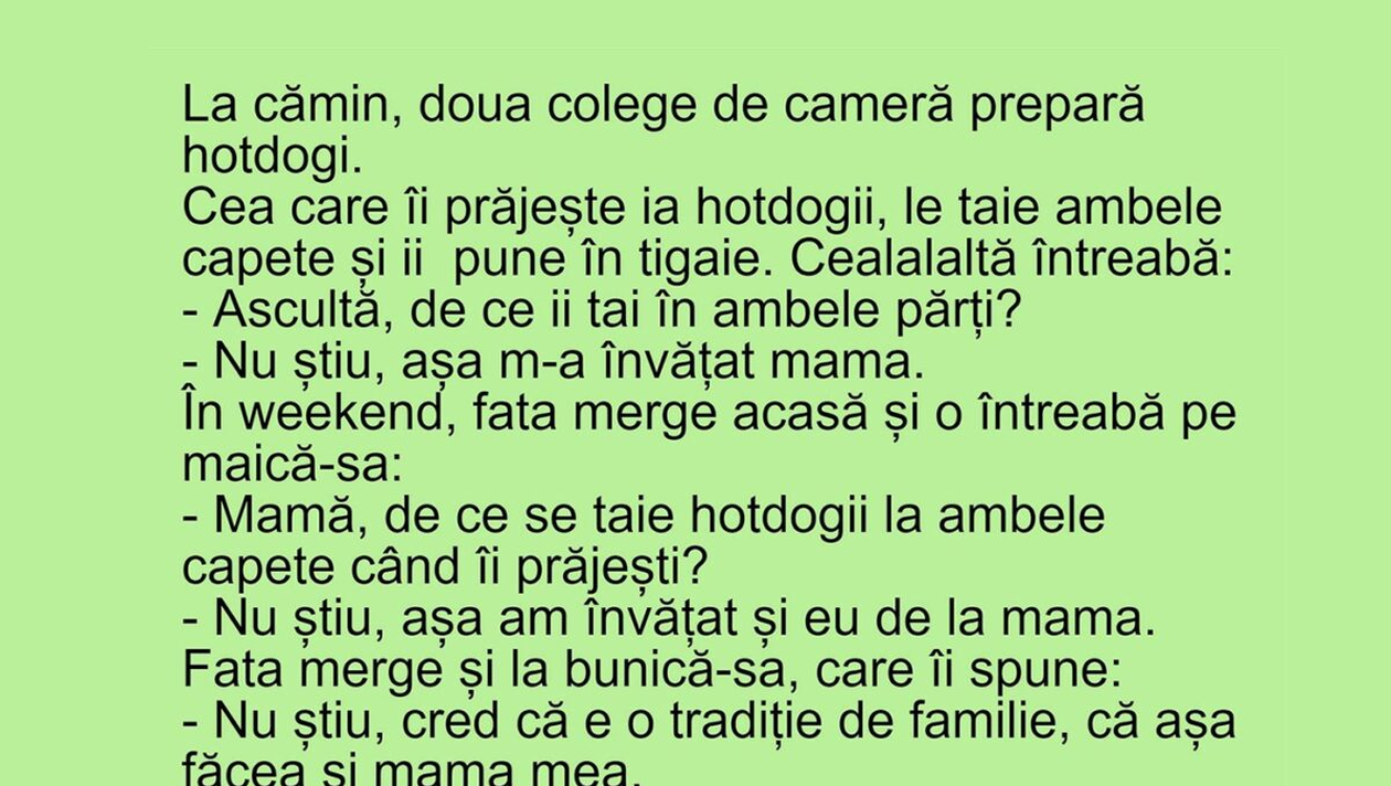 – Mamaie, de ce şi mama şi bunica taie capetele la hotdogi înainte de ai prăji?