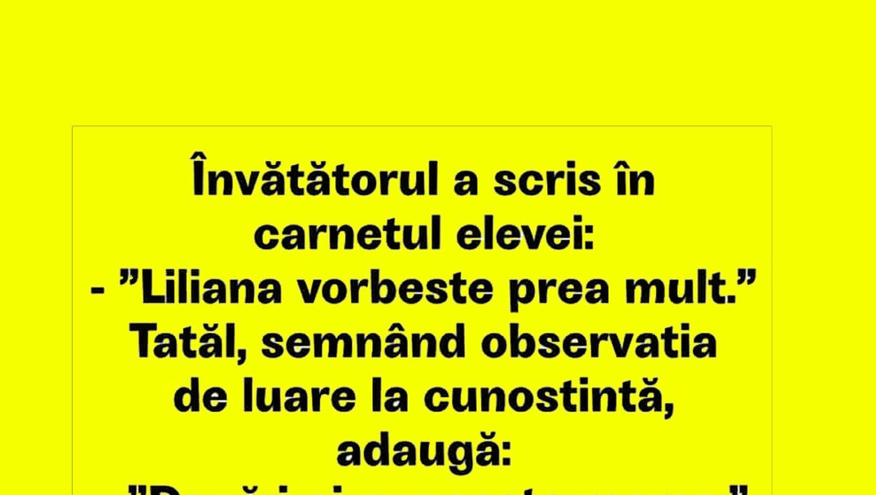Dragi cititori, CANCAN.RO v-a pregătit unul dintre cele mai amuzante bancuri ale dimineții. Un învățător rămâne șocat de răspunsul unui părinte, după ce află că fiica sa vorbește mult.