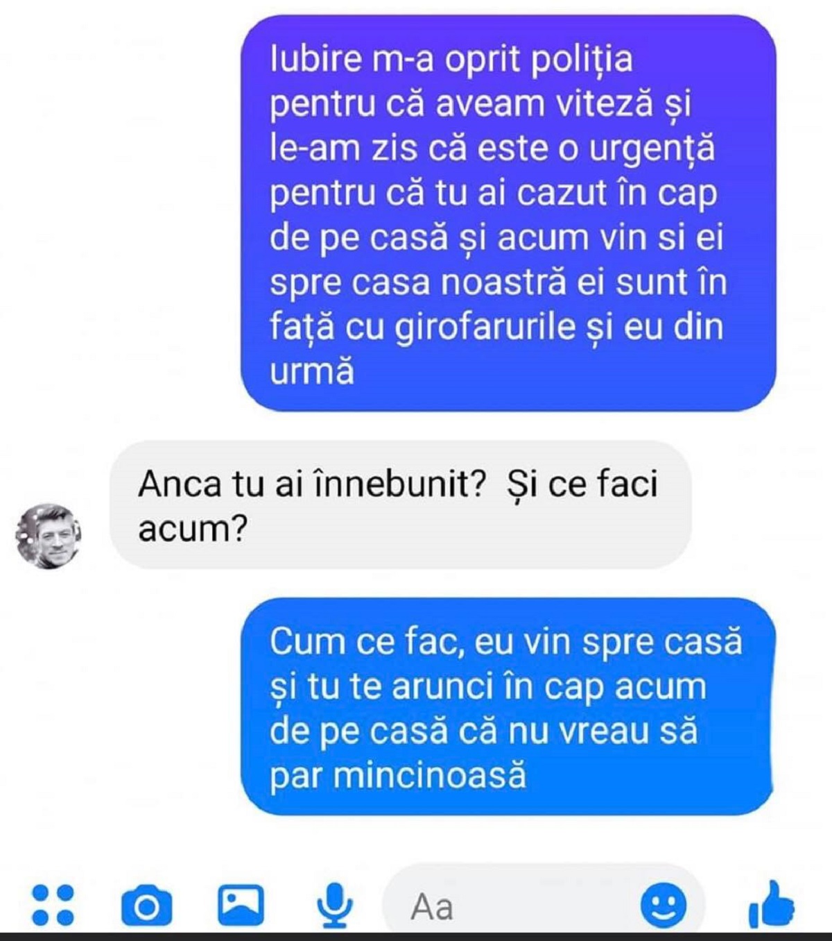 -Iubire m-a oprit poliția pentru că aveam viteză și le-am spus că este o urgență pentru că tu ai căzut în cap de pe casă. Acum vin și ei spre casa noastră. Sunt în fața mea cu girofarul pornit.