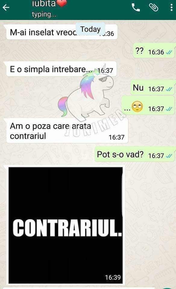Femeile sunt extrem de sceptice atunci când vine vorba de infidelitate, însă unele dintre ele mai fac și haz de necaz pe acest subiect. Un tânăr s-a trezit, într-o zi, cu un mesaj de acest gen din partea iubitei sale și s-a grăbit să-i răspundă, însă iubita lui a avut alte planuri și a vrut, cel mai probabil, să-i testeze încrederea și toleranța. Iată bancul zilei: