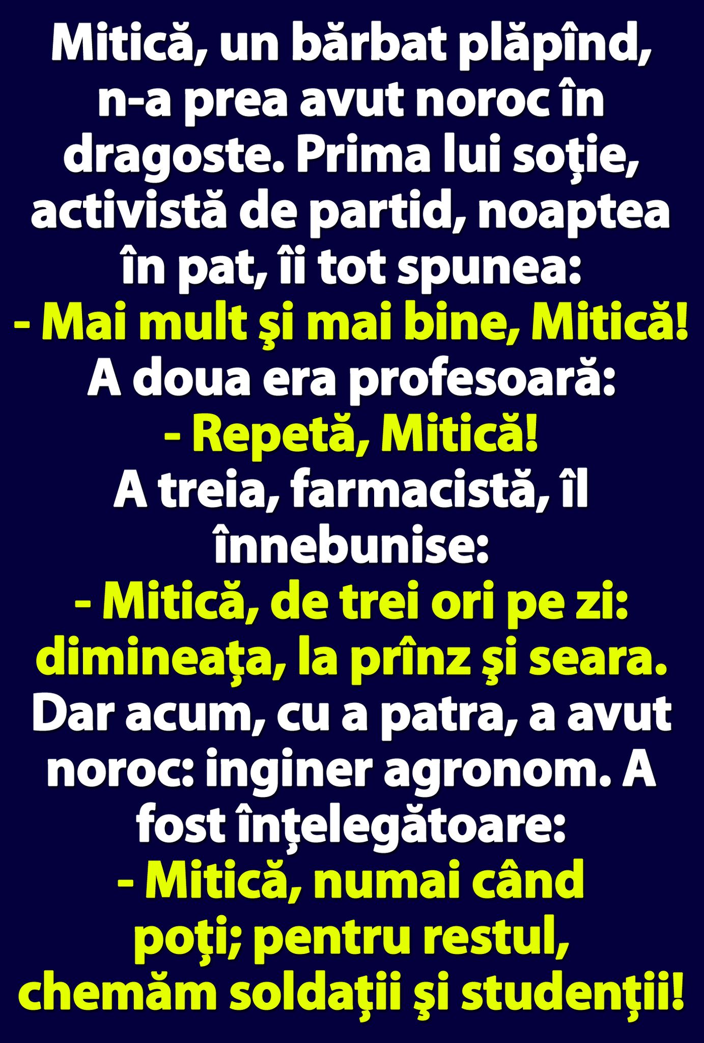 – Mitică, numai cînd poţi; pentru restul, chemăm soldaţii şi studenţii!”