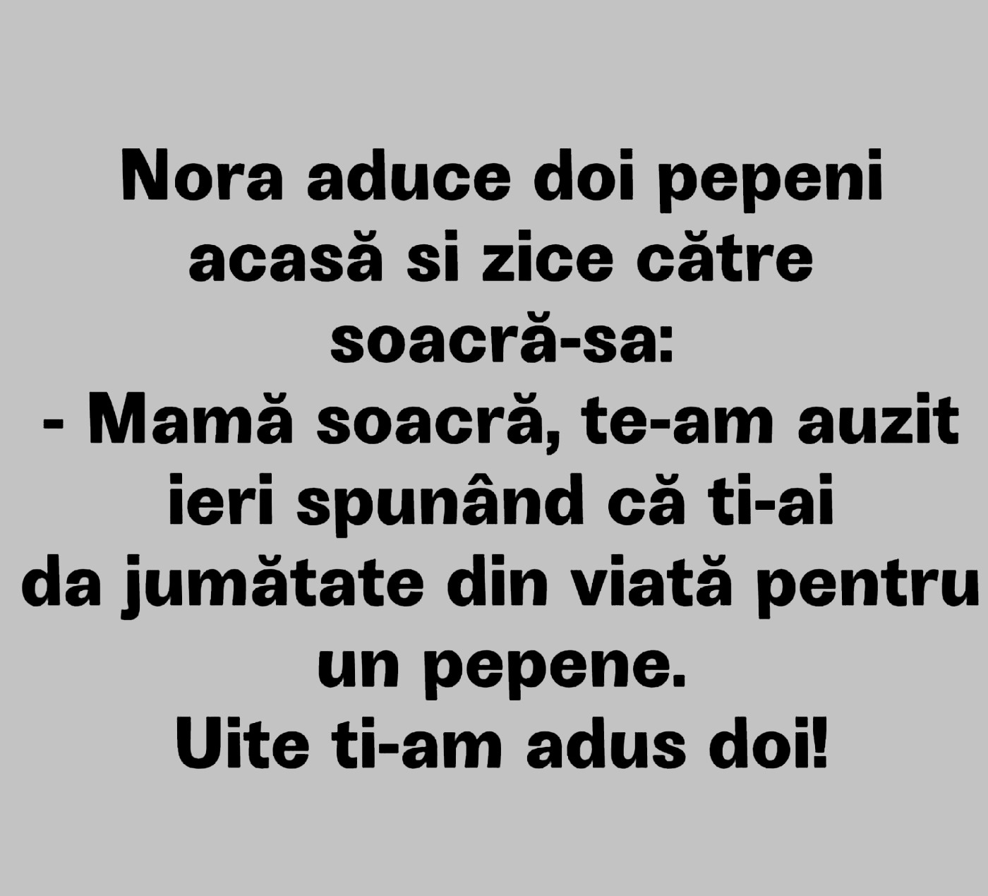 – Mamă soacră, te-am auzit ieri spunând că ți-ai da jumătate din viață pentru un pepene. Uite, ți-am adus doi!