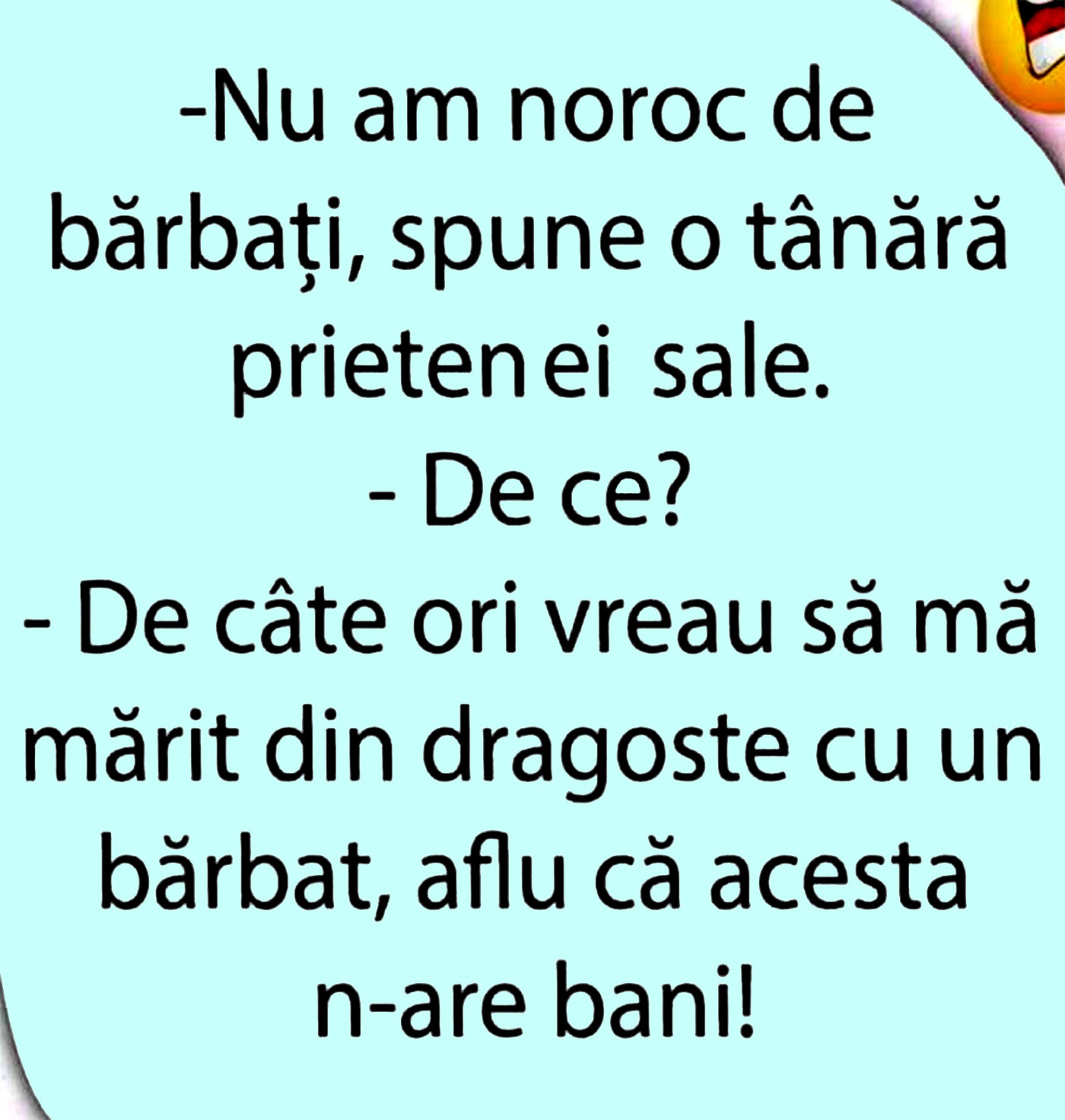 Dragi cititori, CANCAN.RO vrea să vă aducă zâmbetul pe față în această zi, așa că vă pune la dispoziție un banc amuzant. O tânără spune că n-are noroc la bărbați și că dintr-un motiv anume nu-și găsește jumătatea. Ești gata să râzi cu lacrimi?