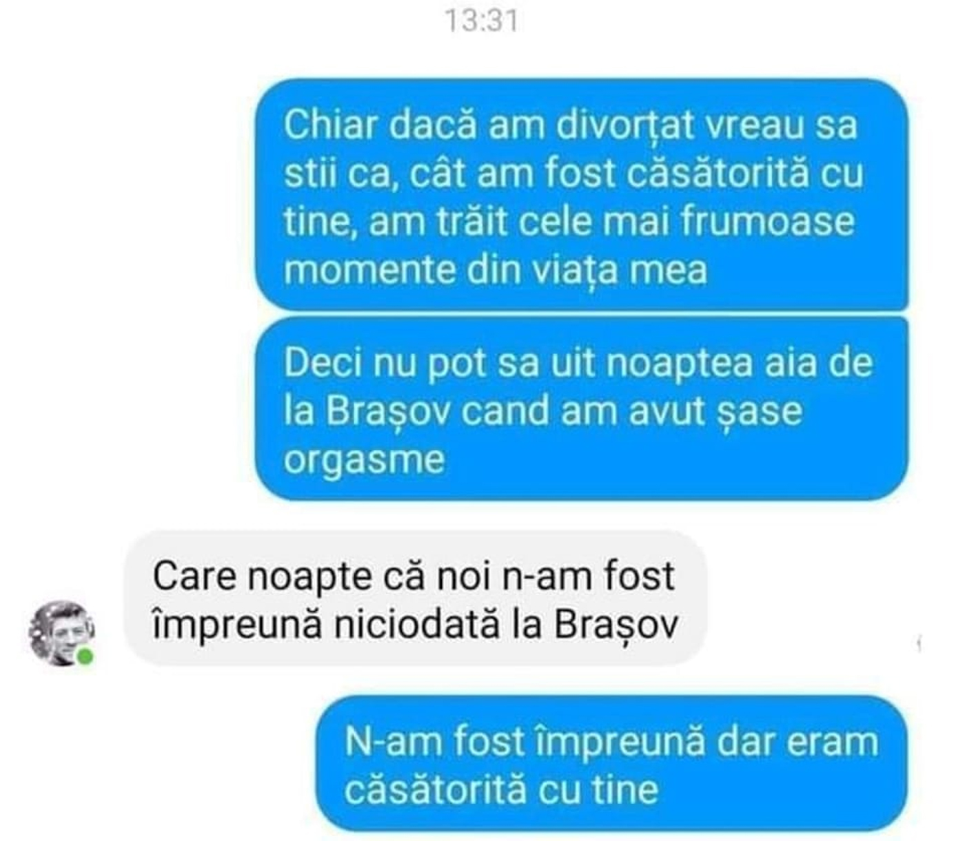„-Chiar dacă am divorțat vreau să știi că atât cât am fost căsătorită cu tine, am trăit cele mai frumoase momente din viața mea. Deci nu pot să uit noaptea aia de la Brașov când am avut șase orgasme.