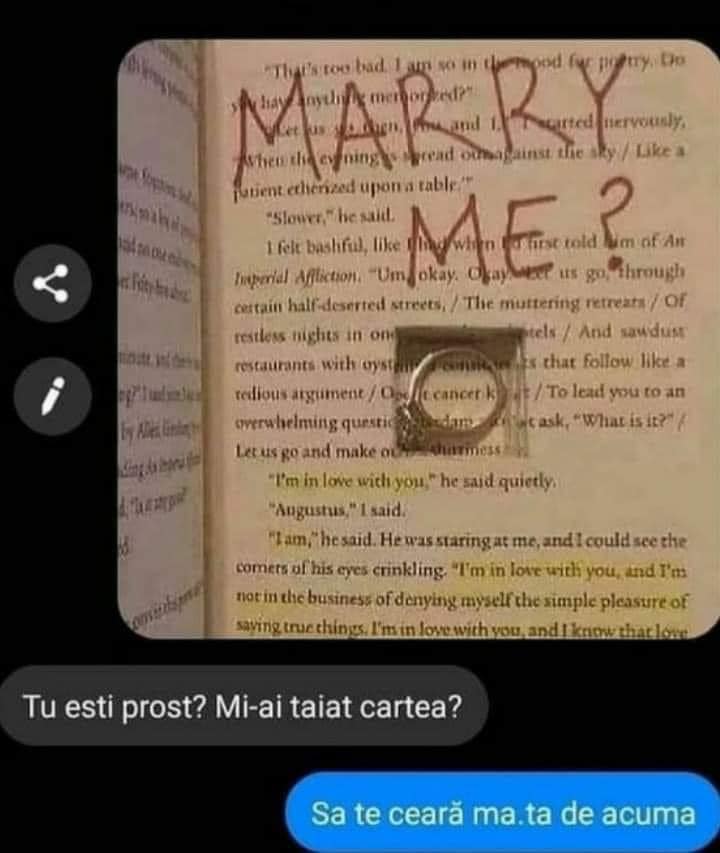 După cum puteți vedea în imaginea de mai jos, bărbat s-a gândit să îi ofere femeii iubite inelul de logodnă pe Facebook Messenger, iar din scenariu nu a lipsit una dintre cărțile ei preferate. Mai mult, el a subliniat anumite replici aflate pe una dintre paginile volumului tipărit în limba engleză, iar în partea de sus i-a adresat marea întrebare!