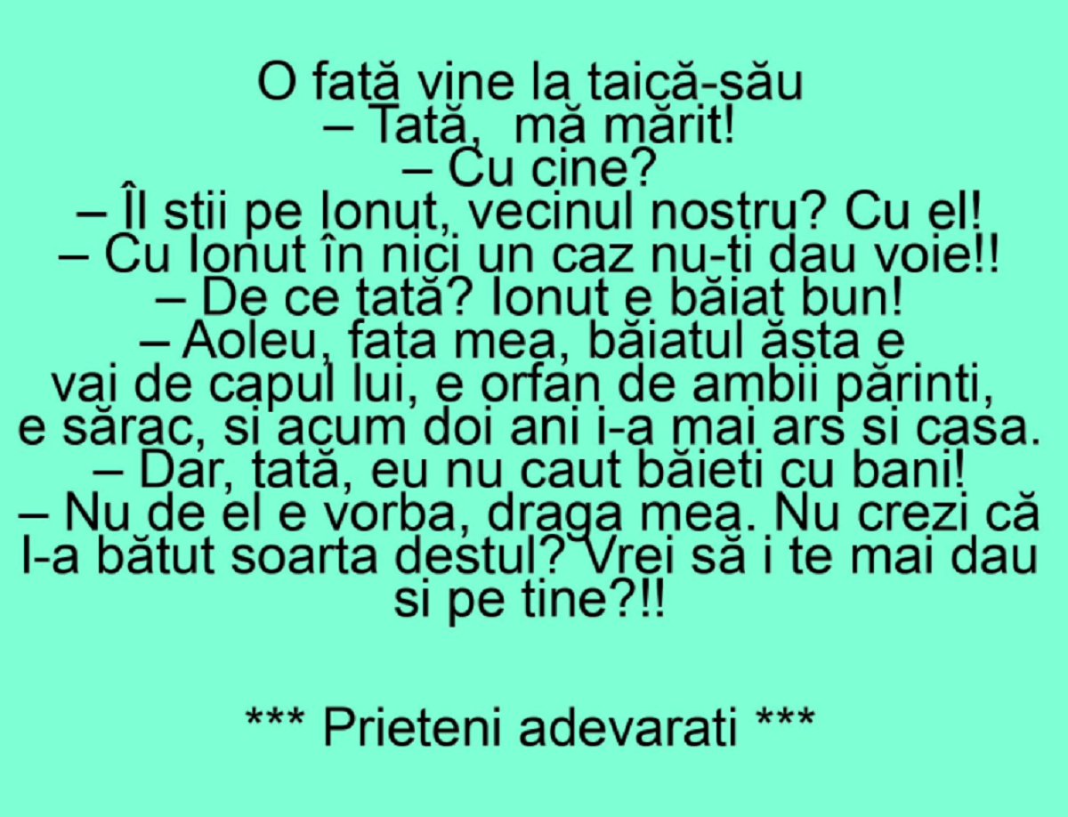 BANCUL ZILEI | O fată vine la taică-său: „Tată, mă mărit cu Ionuț!”