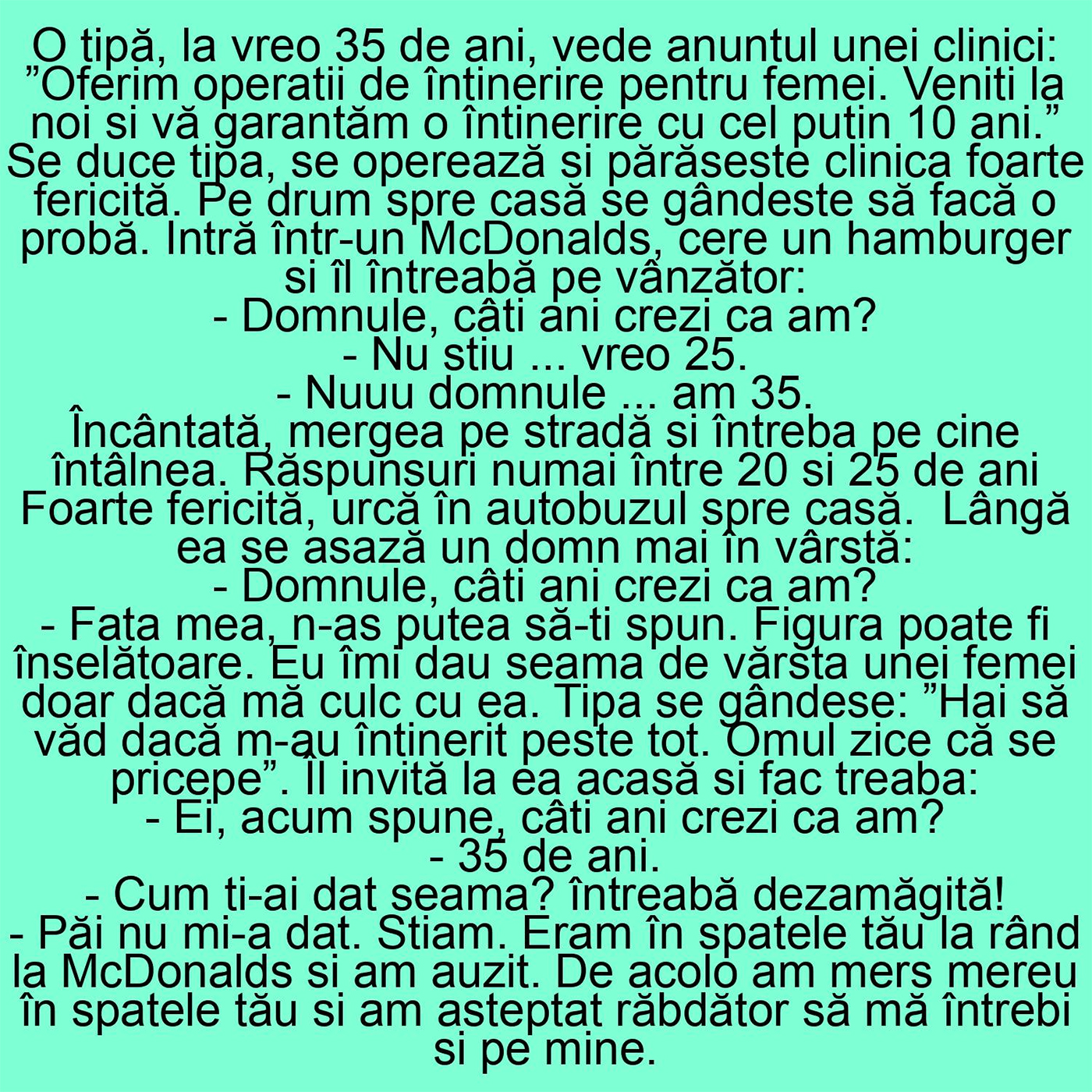 O tipă, la vreo 35 de ani, vede anunțul unei clinici: ”Oferim operații de întinerire pentru femei. Veniți la noi și vă garantăm o întinerire cu cel puțin 10 ani.”