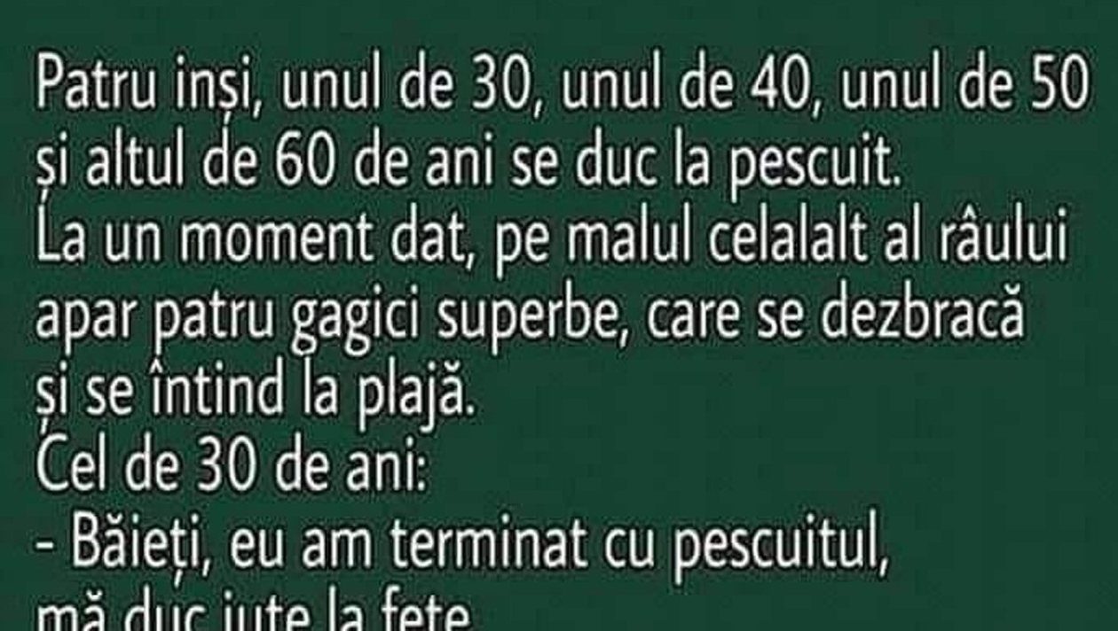 Cel de 30 de ani: -Baieti, eu am terminat cu pescuitul, ma duc la fete. Sare in apa si inoata pana la malul celalalt.