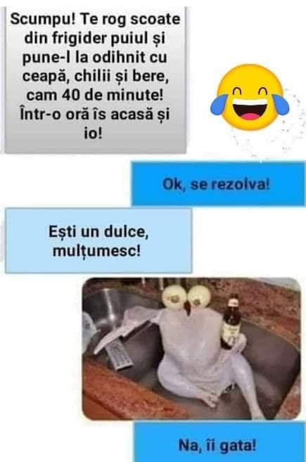 -Scumpule, te rog scoate puiul din frigider și pune-l la odihnit cu ceapă, chilli și bere, cam 40 de minute. Într-o oră ajung și eu acasă.