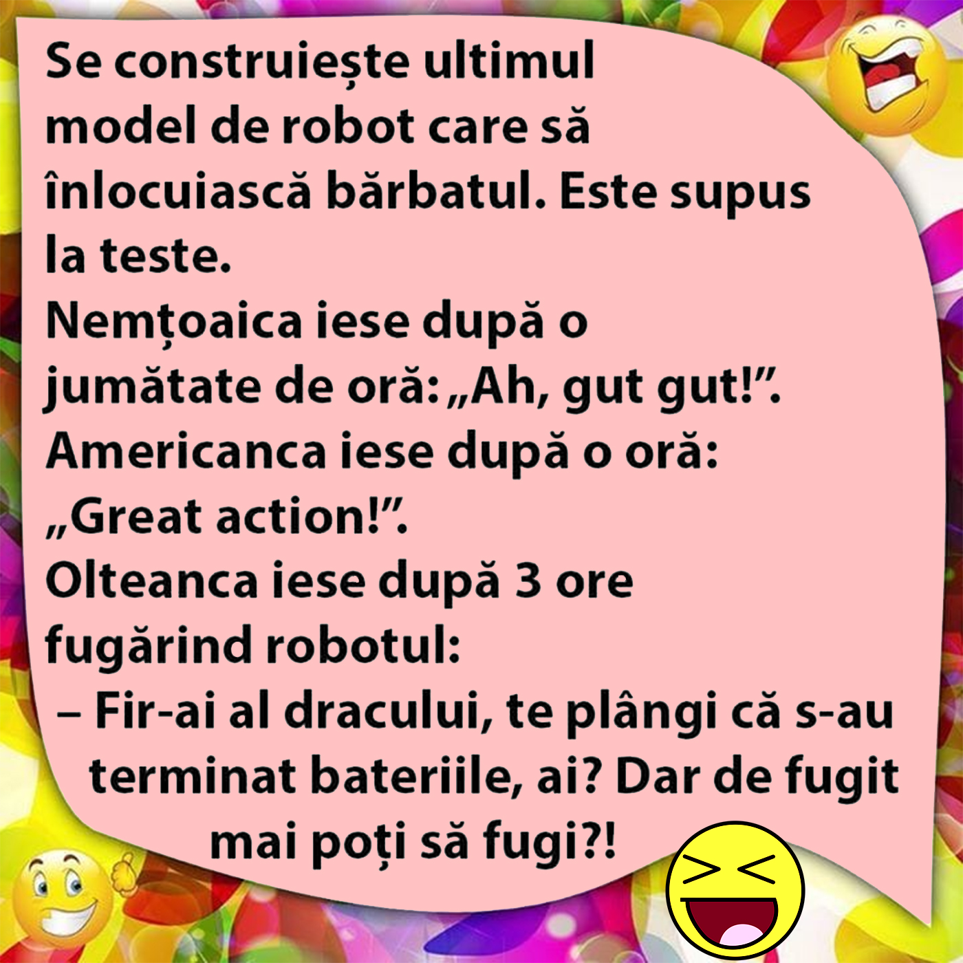 Bancul zilei. O nemțoaică, o americancă și o olteancă testează ultimul model de robot care să înlocuiască bărbatul. Experiențele lor stârnesc amuzamentul! Spor la râs!