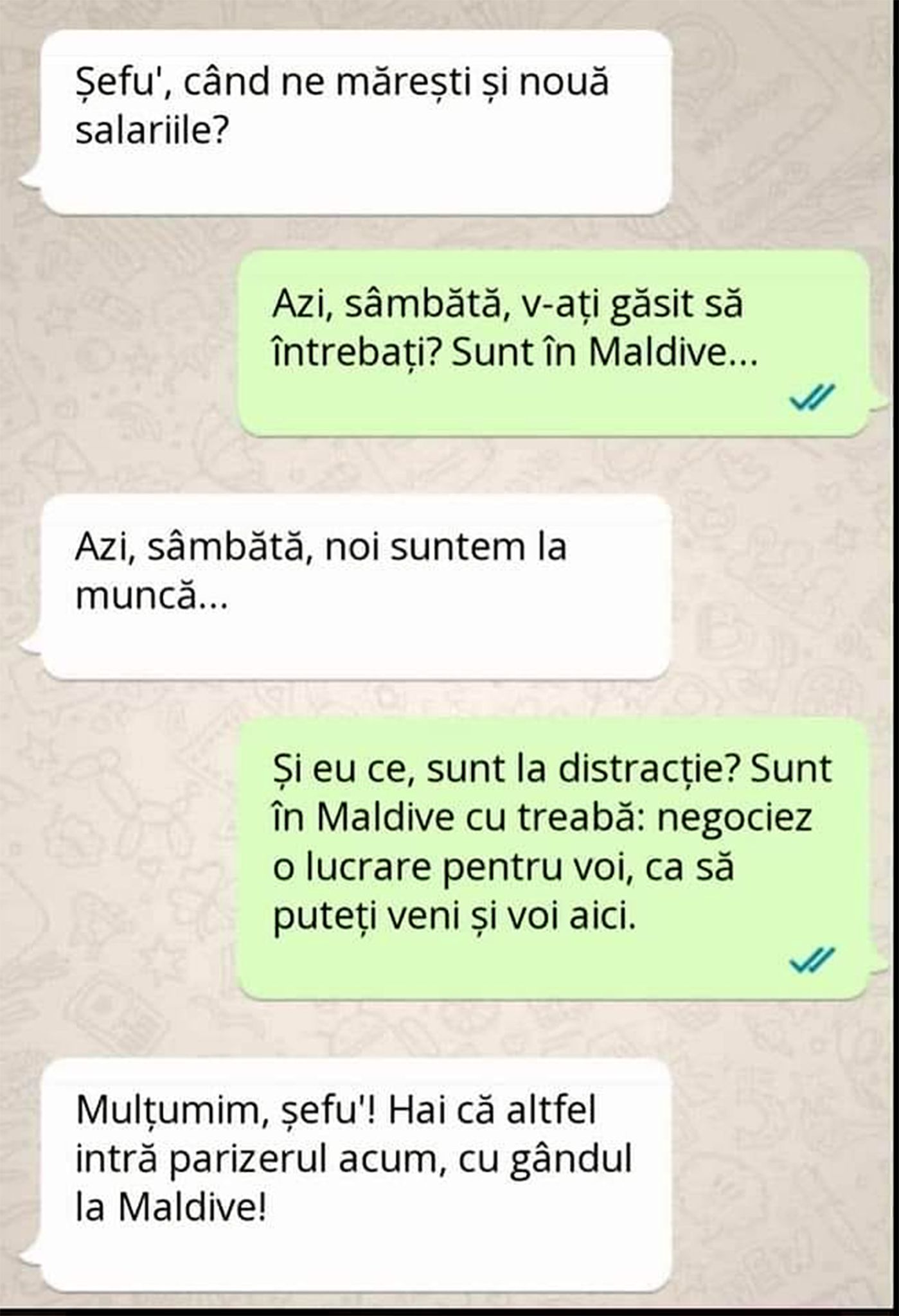 -Mulțumim, șefu`! Hai că altfel intră parizerul acum, cu gândul la Maldive!”