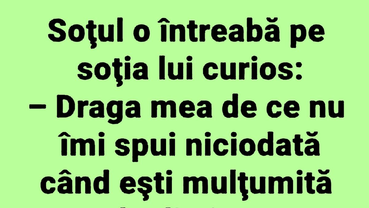 Dragă cititorule, CANCAN.RO ți-a pregătit un banc de nota 10. Discuția haioasă dintre un soț și o soție îți va aduce zâmbetul pe buze. Spor și voie bună!
