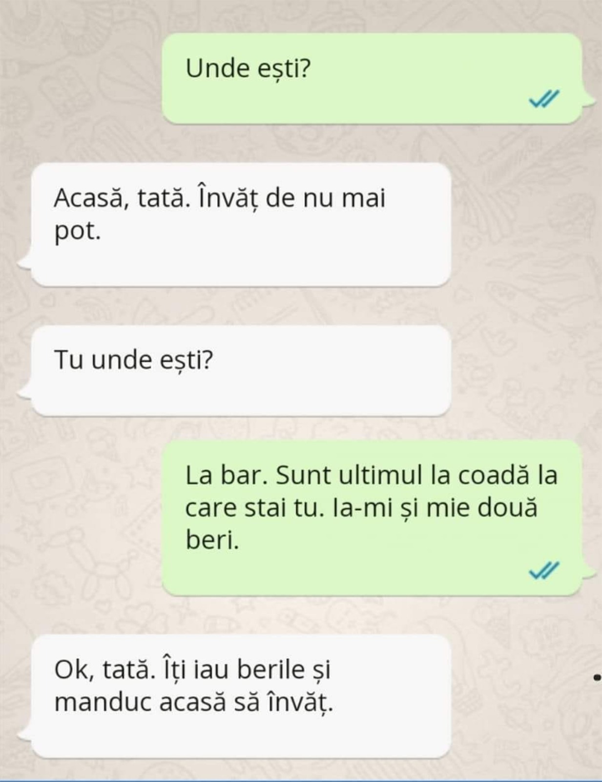 -Ok, tată. Îți iau berile și mă duc acasă să învăț.”