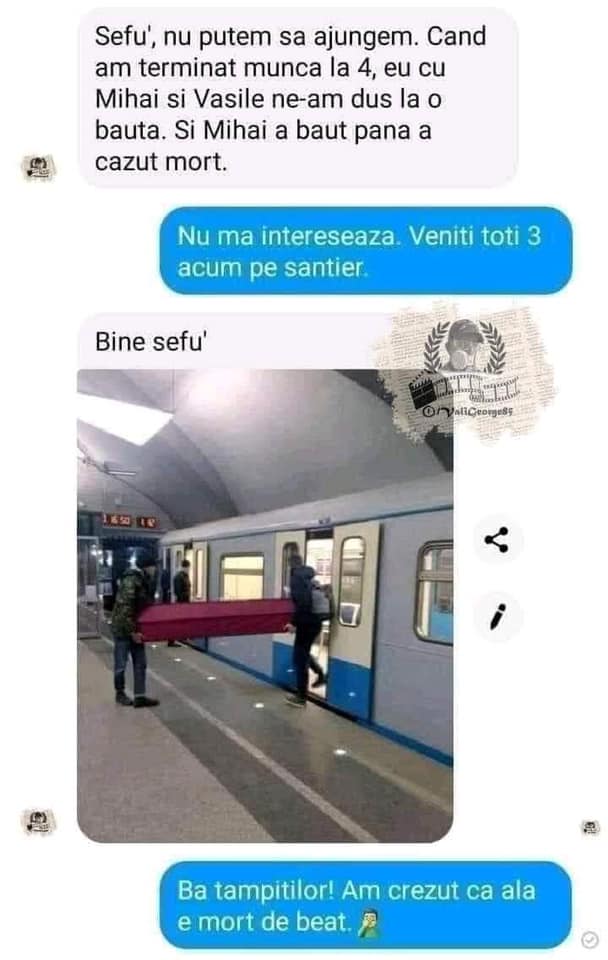 ”-Șefule, nu putem să ajungem. Când am terminat munca la 4, eu cu Mihai și Vasile ne-am dus la o băută. Mihai a băut până a căzut mort.