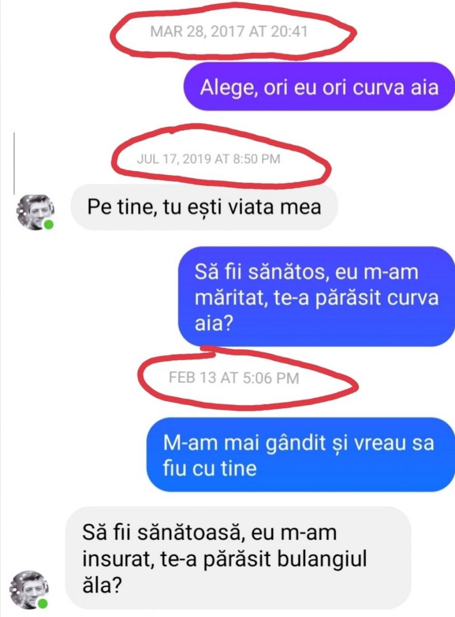 Ea: Să fii sănătos, eu m-am măritat. Te-a părăsit curva aia?