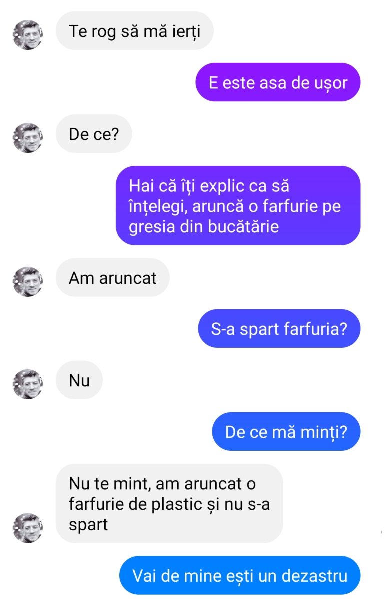 – Hai că îți explic ca să înțelegi. Aruncă o farfurie pe gresia din bucătărie.