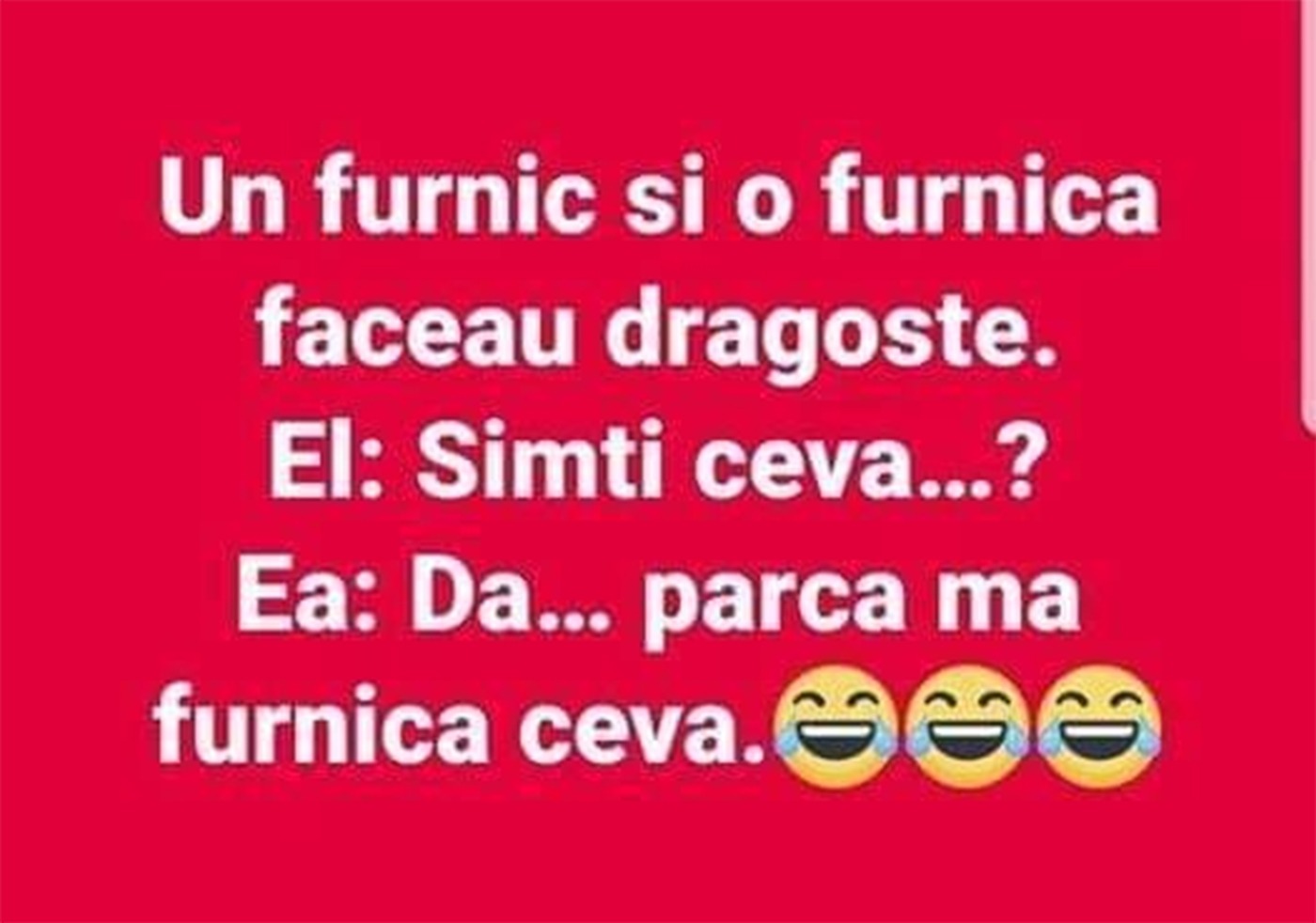 Dragi cititori, weekendul bate la ușă, iar distracția este în toi. CANCAN.ro a pregătit pentru voi un banc copios, menit să vă facă ziua mai bună. Spor la distracție și voie bună! Protagoniștii de astăzi sunt un furnic și o furnică care făceau dragoste.