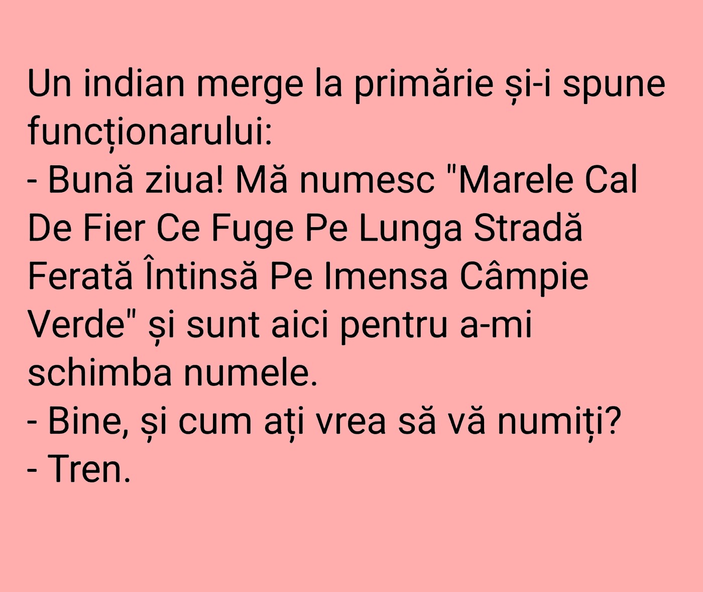 -Bună ziua! Mă numesc „Marele Cal de Fier Ce fuge Pe Lunga Stradă Ferată Întinsă Pe Imensa Câmpie Verde” și sunt aici pentru a-mi schimba numele.