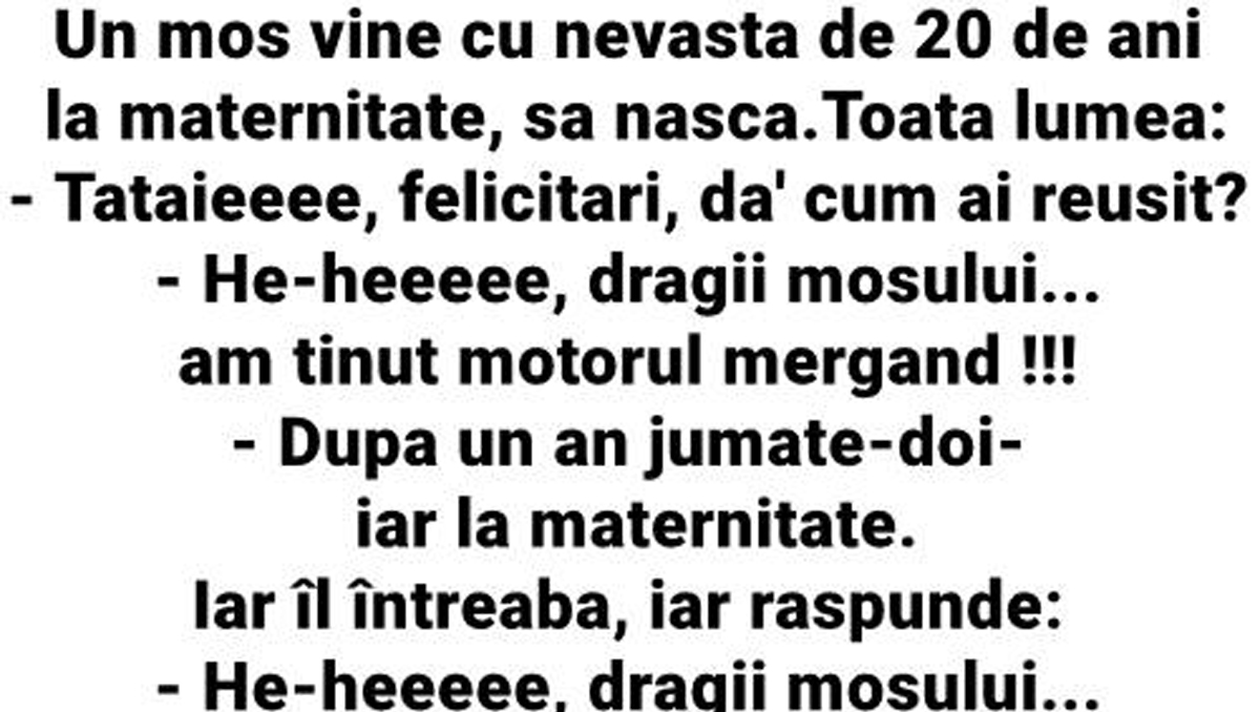 Un moș vine cu nevasta de 20 de ani la maternitate, să nască. Toată lumea: