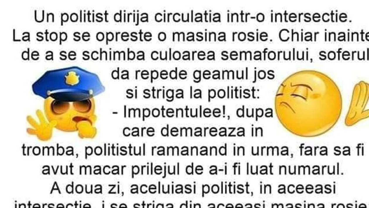 Bancul zilei. Un polițist care dirija circulația într-o intersecție întâlnește un șofer care îl insultă. Spor la râs, dragi cititori!