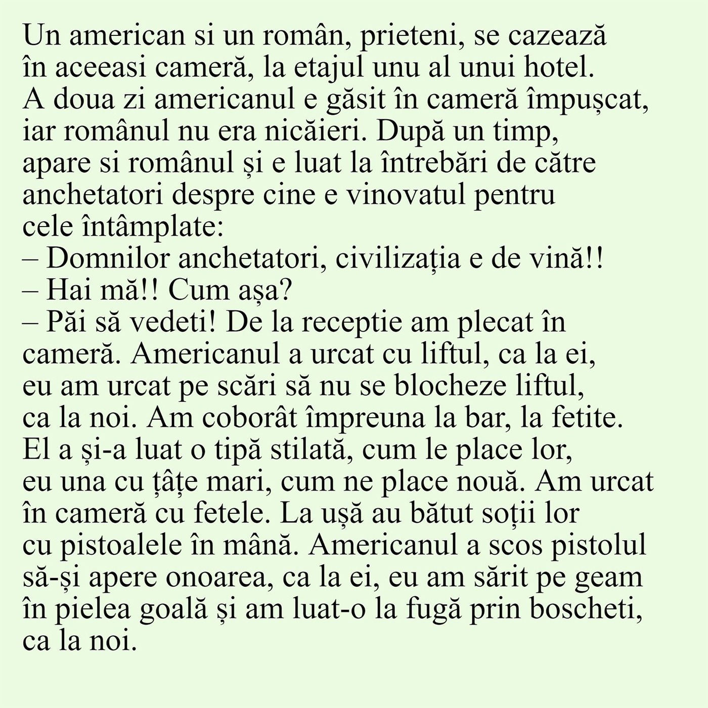 -Păi să vedeți. De la recepție am plecat în cameră. Americanul a urcat cu liftul, ca la ei, eu am urcat pe scări să nu se blocheze liftul, ca la noi. Am coborât împreună la bar, la fetițe. El și-a luat o tipă stilată, cum le place lor, eu una cu țâțe mari, cum ne place nouă. Am urcat în cameră cu fetele. La ușă au bătut soții lor cu pistoalele în mână. Americanul a scos pistolul să-și apere onoarea, ca la ei, eu am sărit în pielea goală și am luat-o la fugă, prin boscheți, ca la noi.”