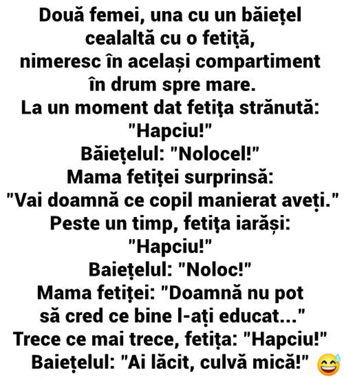 „Două femei, una cu un băiețel, cealaltă cu o fetiță, nimeresc în același compartiment în drum spre mare. La un moment dat, fetița strănută: