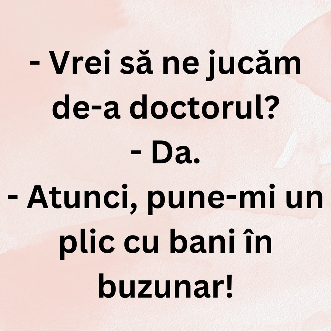 Dragă cititorule, CANCAN.RO ți-a pregătit bancul zilei. Gluma de astăzi îți va aduce zâmbetul pe buze. Ce răspuns primește un bărbat atunci când este întrebat de soția lui dacă vrea să se joace de-a doctorul. Spor și voie bună!