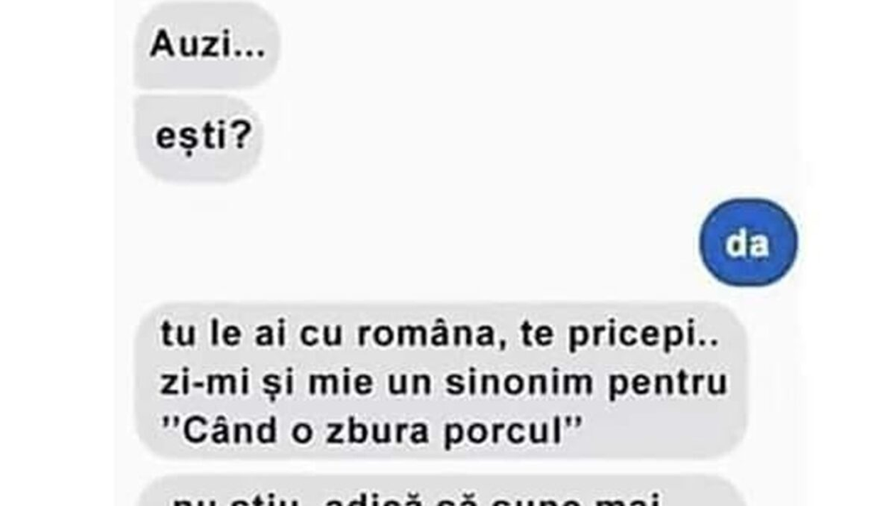 Cu siguranță și tu ai un prieten priceput la toate, dar mai ales la… expresii. Nu-ți va veni să crezi ce ,,sinonim” a inventat o persoană, pentru cunoscuta expresie: ,,Când o zbura porcul”. Dacă ți-am stârnit curiozitatea, mai jos găsești răspunsul care te va face să râzi cu lacrimi. Nu uita să-l dai mai departe și prietenilor tăi.
