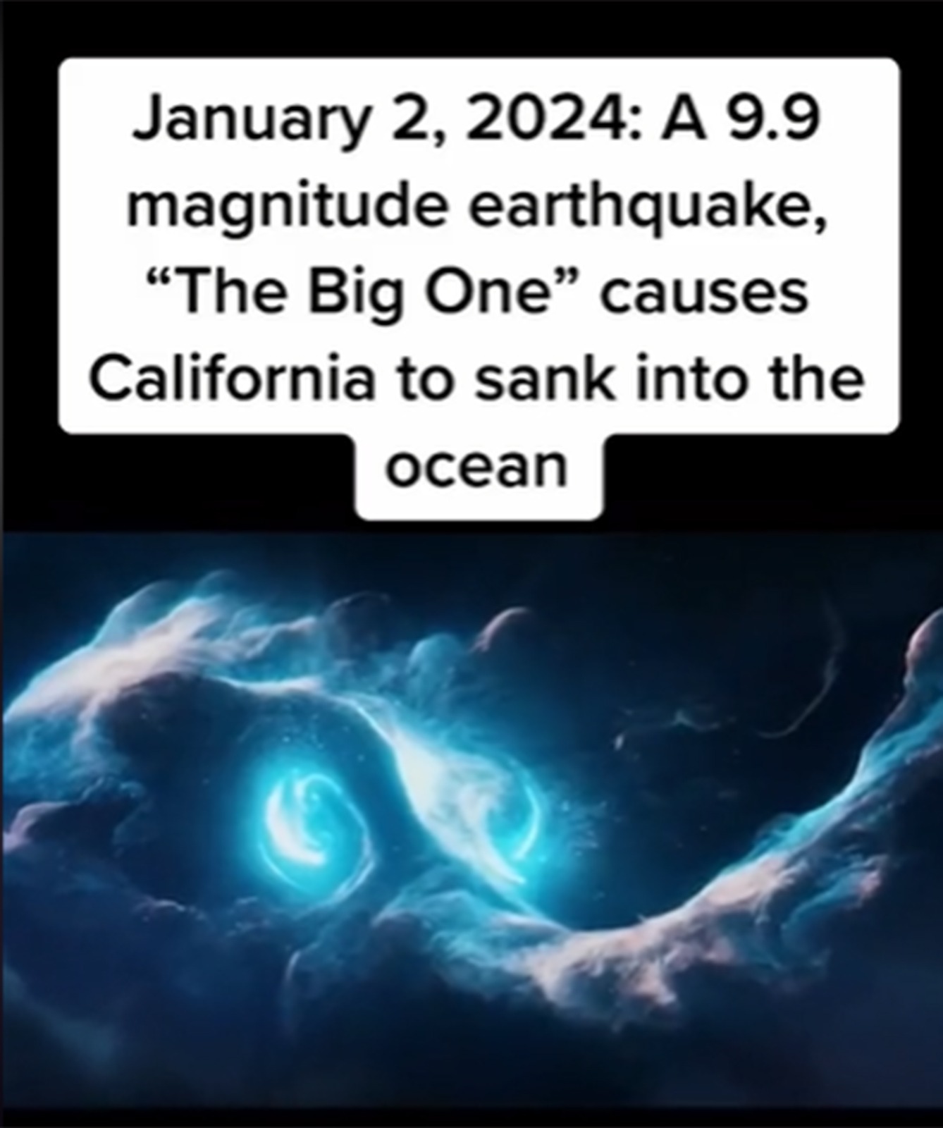 – 2 ianuarie 2024 – un cutremur cu magnitudinea de 9,9 pe scara Richter va face ca statul California să se scufunde în Pacific.