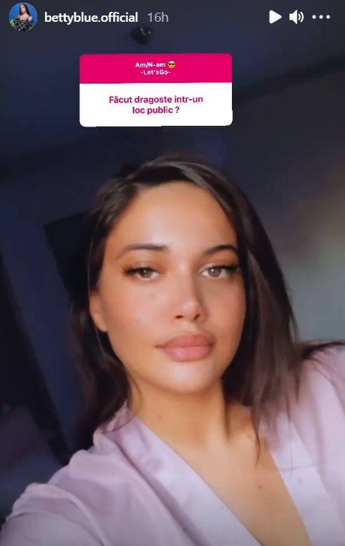 Concret, Betty a recunoscut, într-un story de pe Instagram, că a făcut dragoste într-un loc public. Artista a răspuns afirmativ, spre uimirea admitorilor ei din mediul virtual, care sunt de părere că tânăra este foarte cuminte. Totuși, vedeta nu a precizat și locul unde s-a consumat partida de amor.