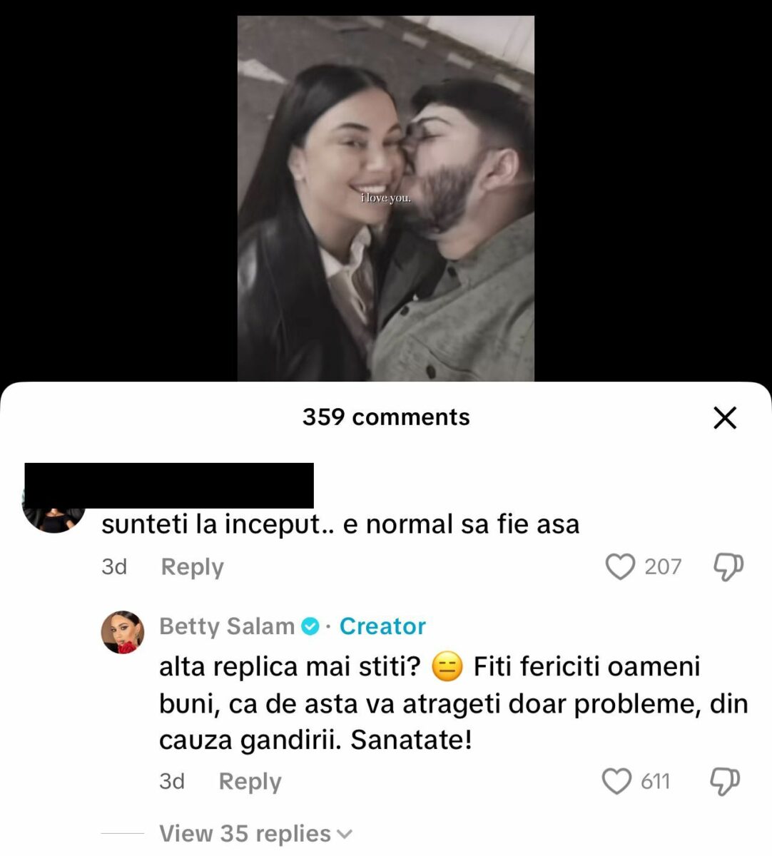 „Altă replică mai știți? Fiți fericiți, oameni buni, că de asta vă atrageți doar probleme, din cauza gândirii. Sănătate!”, a scris Betty Salam, în comentarii, pe TikTok.