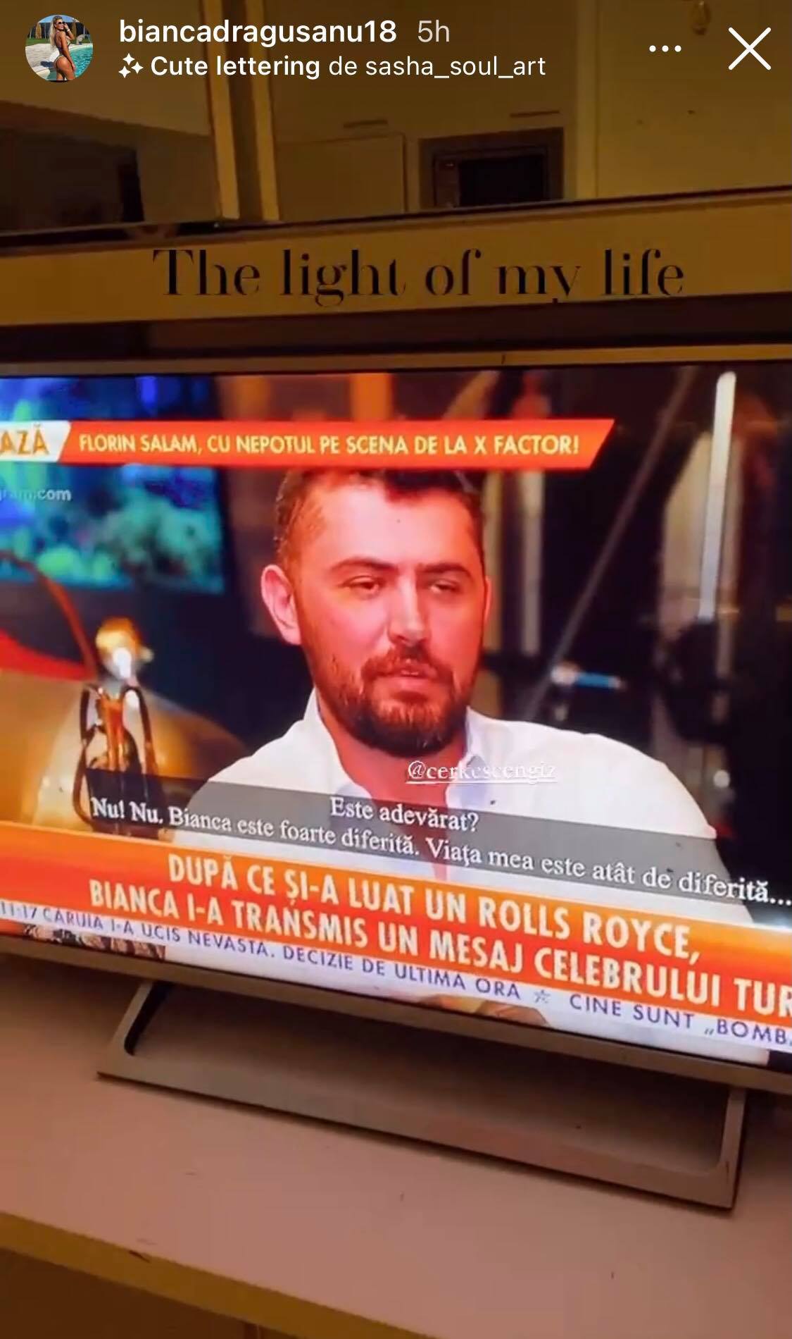 Bianca Drăgușanu a scris pe Instagram în dreptul unui clip ce îl înfățișa pe Cengiz la televizor, etichetându-l la acea postare și scriind „The light of my life” – „Lumina din viața mea”, cuvinte destul de mari la adresa milionarului turc. Bianca a mai scris „Bună dimineața” și părea extrem de bine dispusă, semne că se îndrăgostește pe zi ce trece de „gangsterul” din Turcia?