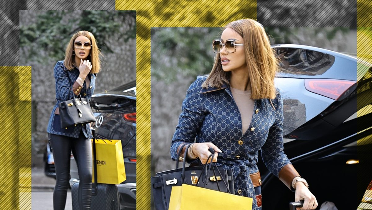 Clar, ceasul și brățările dau tonul! Outfit-ul a fost completat de geaca Gucci, de 2.000 de euro, și de poșeta Hermes Birkin, de 9.000 de euro.