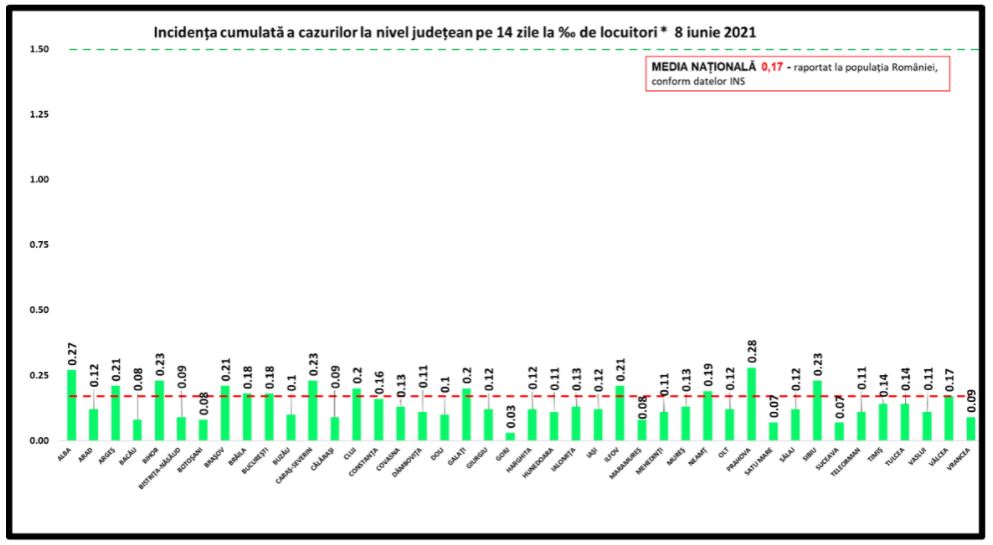 Coeficientul infectărilor cumulate la 14 zile, raportate la 1.000 de locuitori este calculat de către Direcțiile de Sănătate Publică, la nivelul Municipiului București și al județelor. Mai jos aveți graficul realizat în baza raportărilor primite de CNCCI de la Direcțiile de Sănătate Publică: