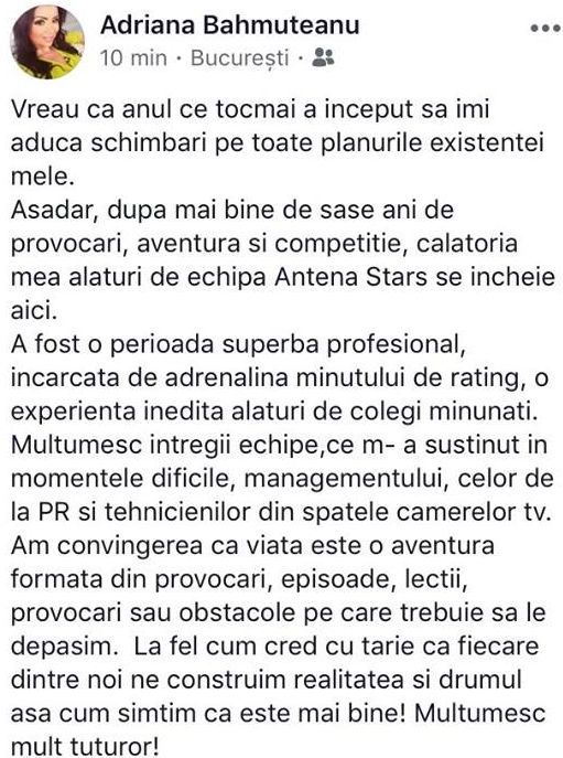 „Vreau ca anul ce tocmai a trecut să-mi aducă schimbări pe toate planurile existenţei mele. Aşadar, după mai bine de şase ani de provocări, aventură şi competiţie, călătoria mea alături de echipa Antena Stars se încheie aici. A fost o perioadă superbă profesional, încărcată de adrenalina minutului de rating, o experienţă inedită alături de colegi minunaţi. Mulţumesc întregii echipe ce m-a susţinut în momentele dificile, managementului, celor de la PR şi tehnicienilor din spatele camerelor tv. Am convingerea că viaţa este o aventură formată din provocări, episioade, lecţii, provocări sau obstacole pe care trebuie să le depăşim. La fel cum cred cu tărie ca fiecare dintre noi ne construim realitatea şi drumul aşa cum simţim că este mai bine. Mulţumesc tuturor”, a scris Adriana Bahmuţeanu, pe contul ei personal de Facebook.