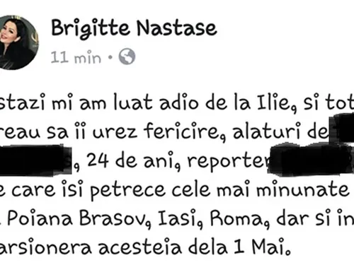 “Astăzi mi-a luat adio de la Ilie, și tot astăzi, vreau să îi urez fericire alături de D.D, 24 de ani, reporter la @#%$%, alături de care își petrece cele mai minunate momente la Poiana Brașov, Iași, Roma, dar și în garsoniera acesteia de la 1 Mai”, a scris Brigitte Sfăt pe contul personal de Facebook.