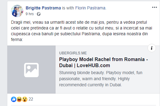 ”Dragii mei, vreau sa urmariti acest site de mai jos, pentru a vedea pretul celei care pretindea ca ar fi avut o relatie cu sotul meu, si a incercat sa mai ciupeasca ceva banuti pe subiectului Pastrama, dupa iesirea noastra din ferma”, este mesajul postat de Brigitte Pastramă pe pagina sa de socializare.