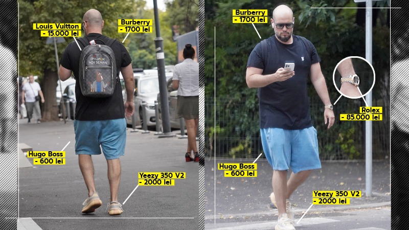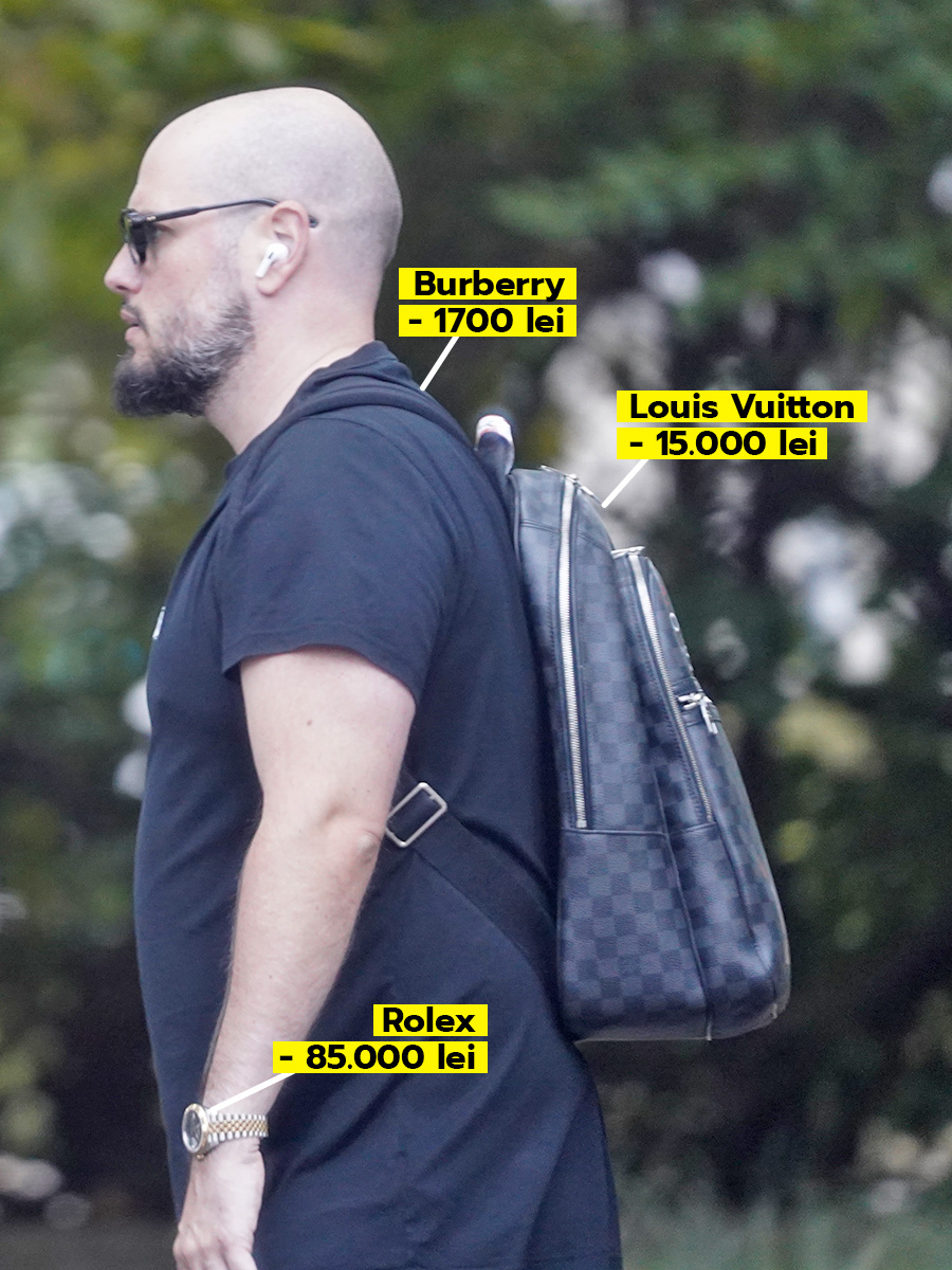 Totuși, și-a pus la mână un ceas Rolex “Chocolate Dial”, în valoare de 85.000 lei și și-a tras în spate un ghiozdan Louis Vuitton, care costă nu mai puțin de 15.000 lei. Cu așa accesorii, vloggerul a decis să nu epateze într-atât, așa că a ales un tricou negru… dar de brand. Burberry.