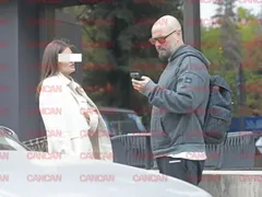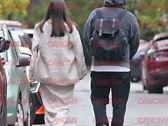 Îmbrăcat într-o pereche de pantoni de trening, un hanorac și gluga pe cap, BRomania pare că nu s-a agitat foarte mult pentru întâlnire, spre deosebire de femeia cu care a ieșit în oraș. Șatena a ales o rochie lungă bej, asortată cu un sacou de aceeași culoare, semn că pentru ea este un date destul de…important.