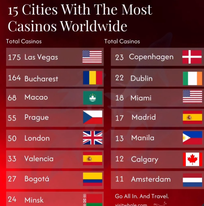 În topul orașelor cu cele mai multe cazinouri, pe primul loc se află, cum era de așteptat, Las Vegas. Orașul domină topul mondial cu un total de 175 de cazinouri active. Însă, cu adevărat surprinzător este cine se află pe locul doi.