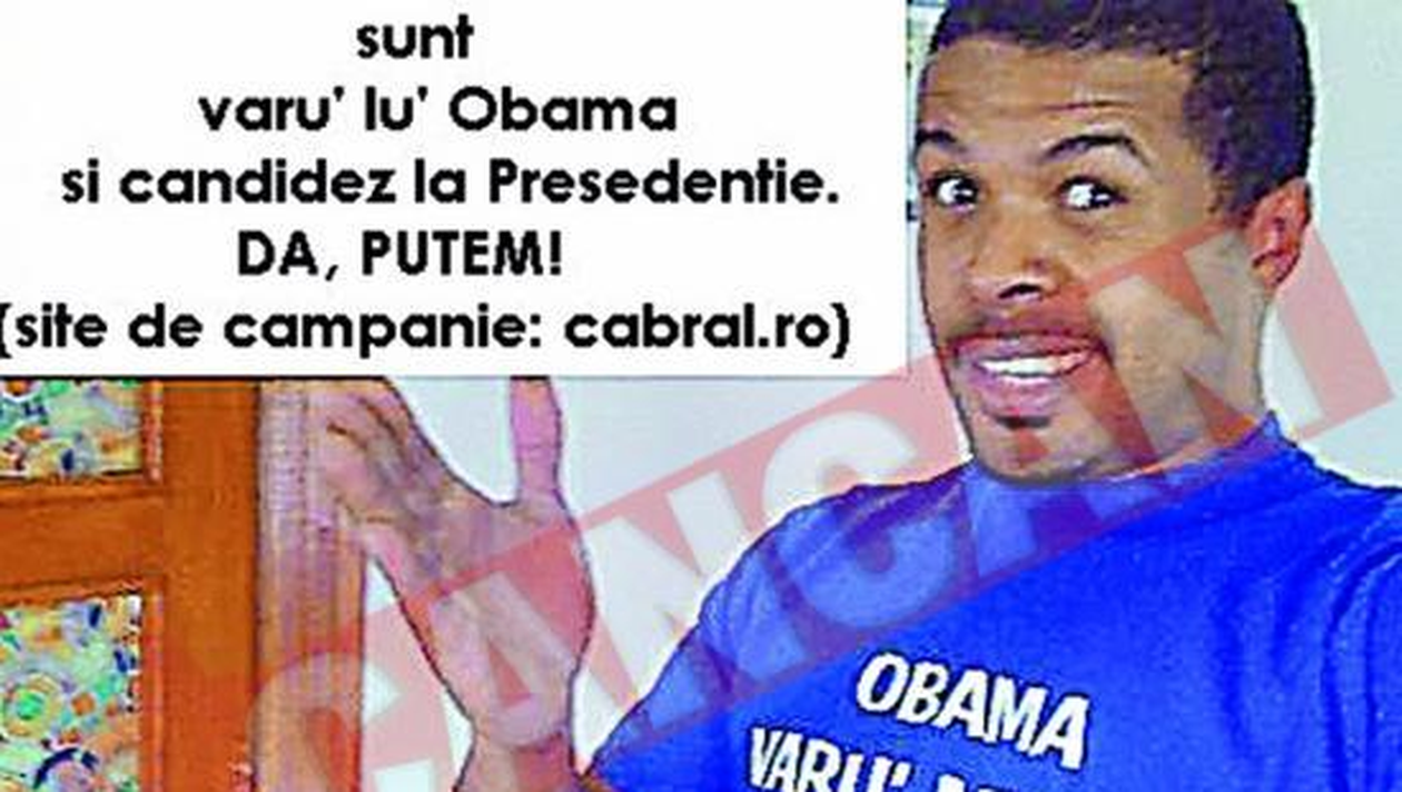 GLUMA. Prezentatorul „Povestirilor de noapte”, Cabral, s-a distrat postand pe blogul sau anuntul unei candidaturi la presedintia Romaniei Cu sloganul „sunt varul lui Obama si candidez la presedentie”, simpaticul prezentator de televiziune Cabral si-a lansat, pe blogul sau, candidatura pentru cea mai inalta functie in stat. Gluma lui Cabral a pornit de la o sugestie a colegilor sai, care au „construit” un sondaj cu titlul „Ce presedinte de culoare ai vota pentru Romania?”. Pus pe sotii, prezentatorul emisiunii „Povestiri de noapte” s-a lansat deja intr-o campanie electorala virtuala pe blogul sau, sustinut fiind si de un videoclip haios, unde se prezinta drept „varul lui Obama”, proaspatul presedinte american. Sigur, in stilul binecunoscut, Cabral face si o precizare: „daca aude mama ca m-am mutat la Cotroceni, ma bate de-mi sare apa in cap” . „Intra si da-mi un vot” isi indeamna Cabral cititorii, folosind corespondentul romanesc al deja consacratei expresii americane de campanie a lui Obama, „yes, we can”. Deci, „da, putem”, isi incurajeaza Cabral viitorii votanti!