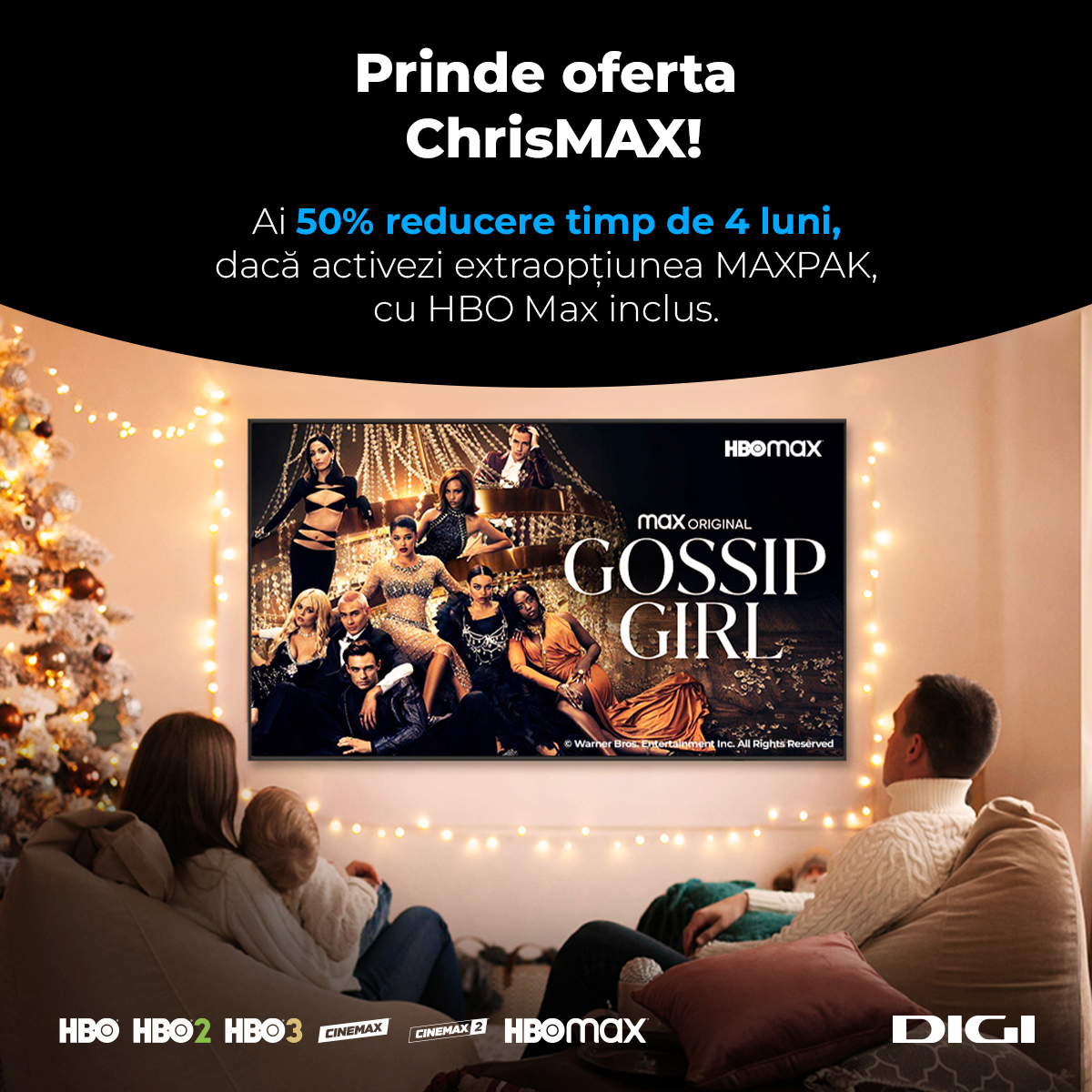 Este vorba despre oferta ChrisMAX de la Digi RCS-RDS. Activează-ți acum extraopțiunea MAXPAK cu canalele HBO, Cinemax și HBO Max incluse și te bucuri de 50% reducere, timp de 4 luni. Oferta este disponibilă pe DIGI.ro și în magazinele DIGI.