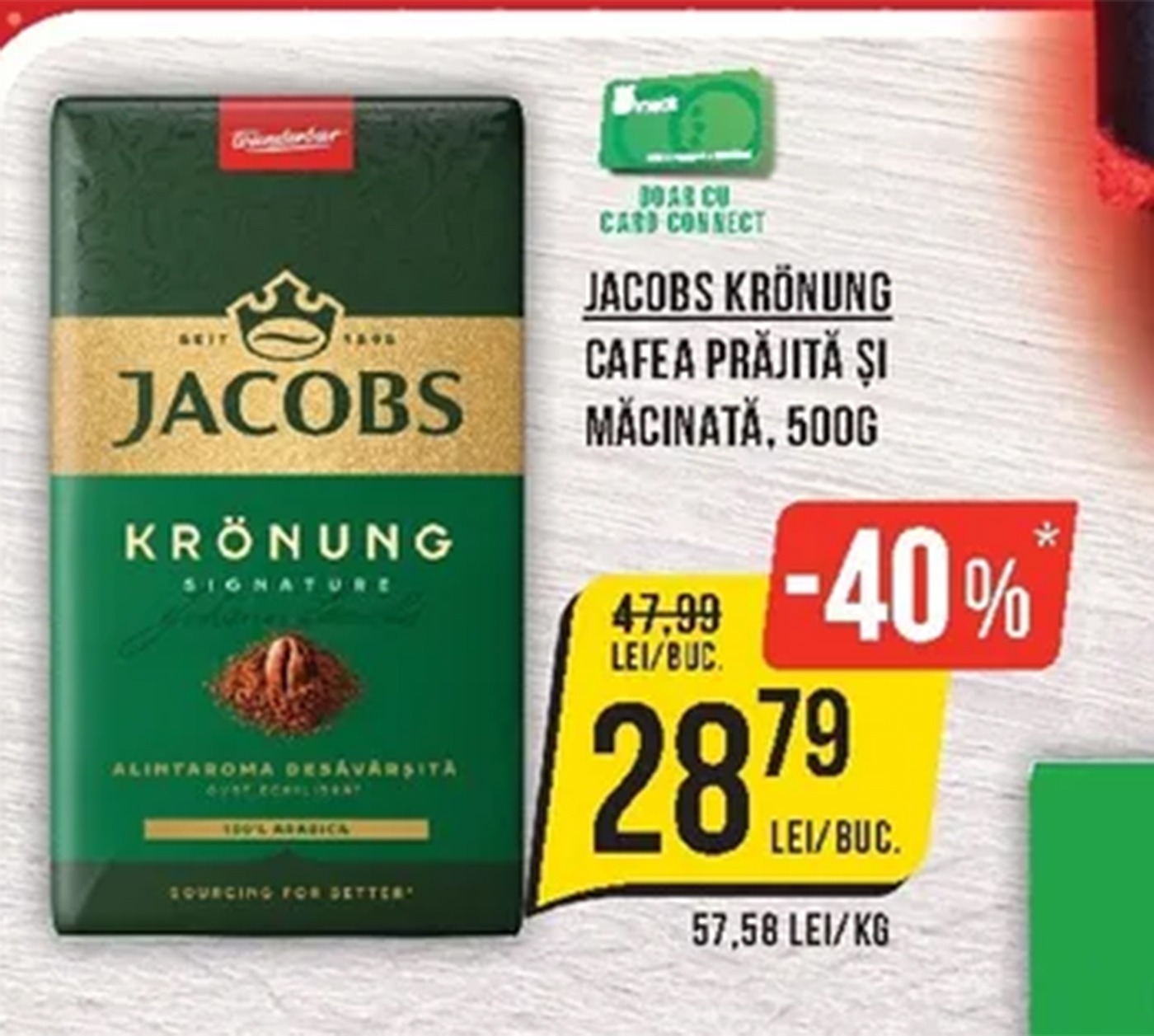 Unul dintre produsele centrale ale campaniei este cafeaua Jacobs Krönung, pachet de 500 de grame. Prețul scade de la 47,99 lei la 28,79 lei, reducerea fiind de 40%. Oferta este valabilă doar cu Card Connect.