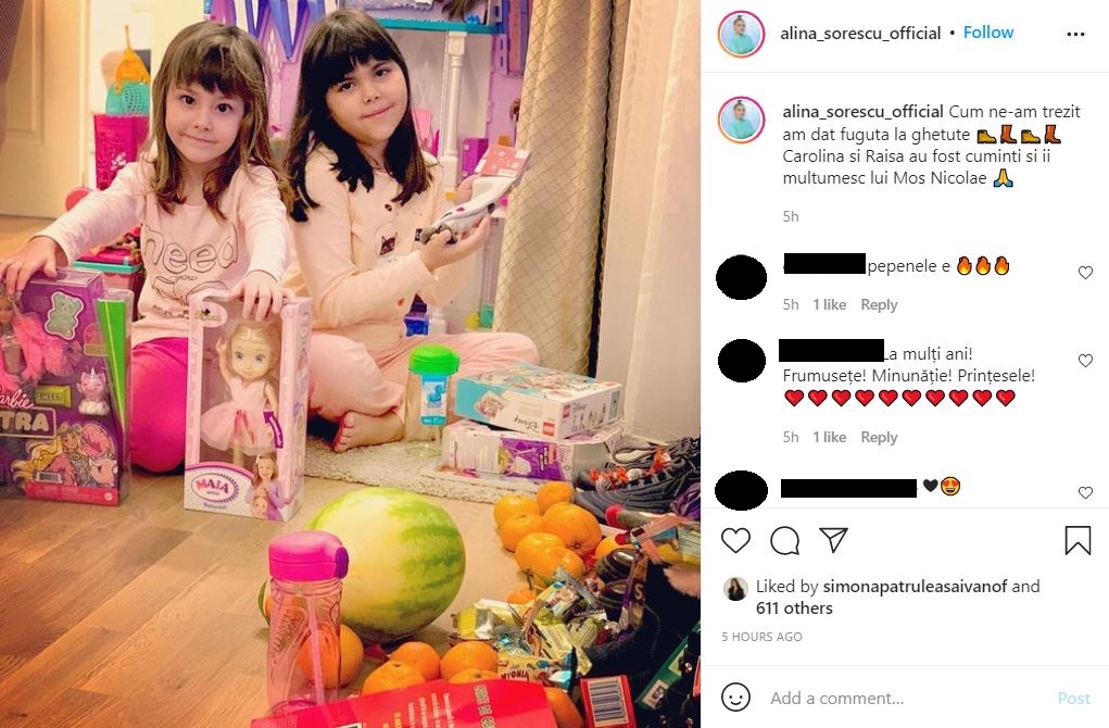 ”Cum ne-am trezit am dat fuguța la ghetuțe ????Carolina și Raisa au fost cuminți și îi mulțumesc lui Moș Nicolae ?”, este mesajul scris de Alina Sorescu pe Instagram.