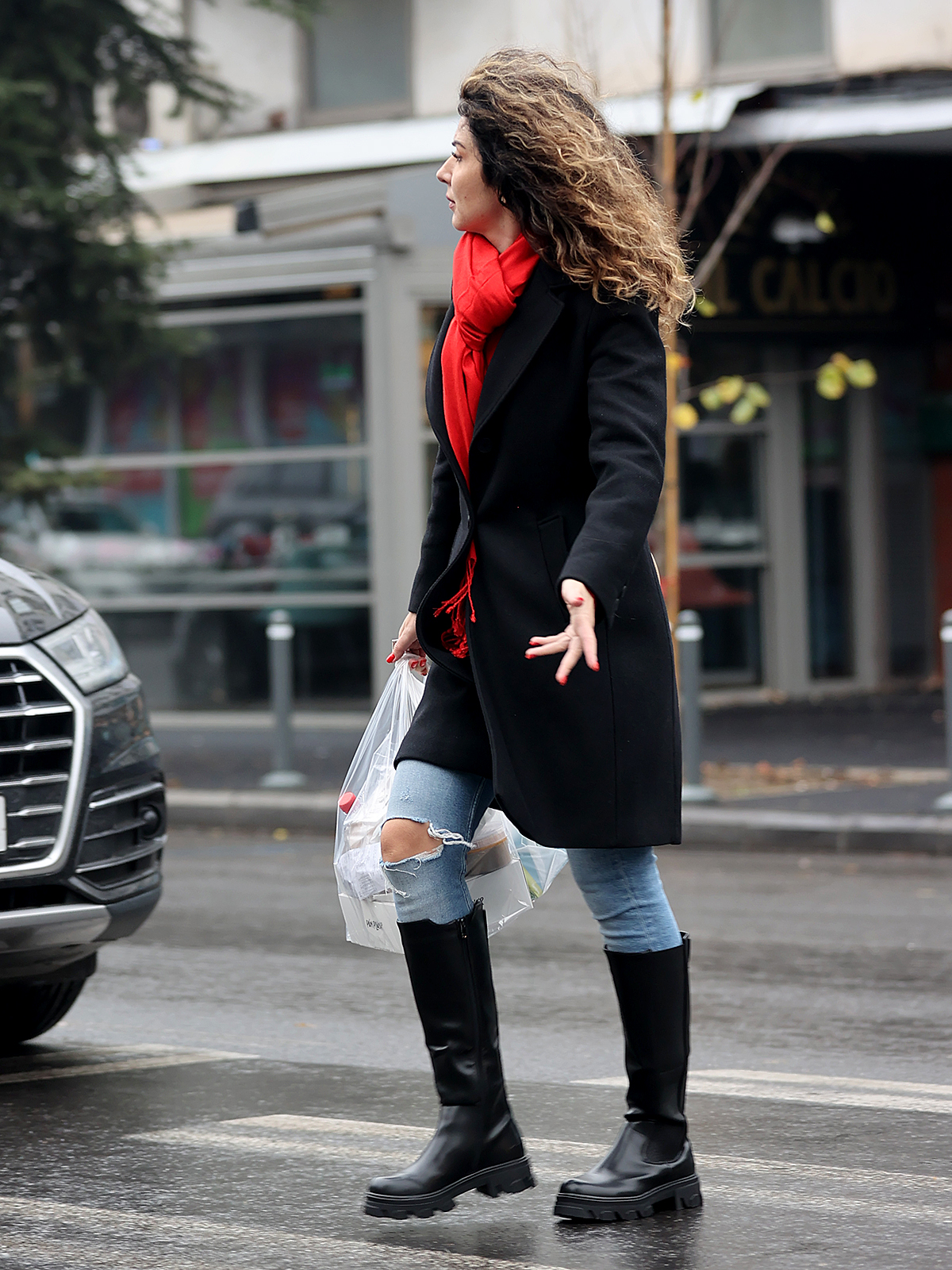 Iar iubita lui Mircea Badea a ales pentru „escapada” la patiserie o pereche de blugi rupți, prin care putea intra lejer frigul. Totuși, în partea de sus a atașat un palton negru, destul de lung, iar în picioare a încălțat o pereche de cizme negre. Ținutei a atașat și o pată de culoare, căci a ales o eșarfă roșie pe care și-a pus-o la gât.