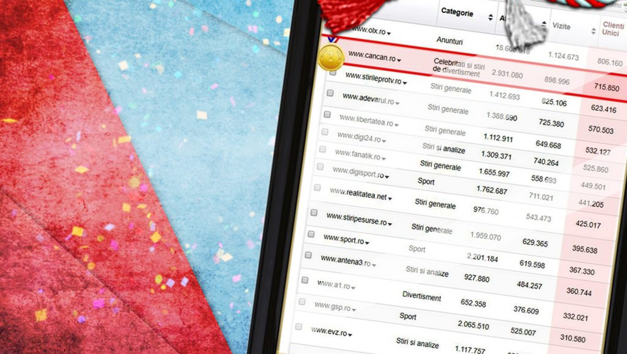 CANCAN.RO, site-ul nr.1 din România, începe luna martie în forță și își continuă hegemonia online. Demonstrând că nimic nu este întâmplător, echipa CANCAN.RO întregistrează încă o victorie zdrobitoare și se instalează, din nou, pe primul loc în topul site-urilor din România. Vineri, 1 martie, CANCAN.RO a reușit să învingă concurența pe toate cele trei segmente – clienți unici, vizite și afișări -, oferind tuturor cititorilor încă o dovadă că suntem cei mai buni!