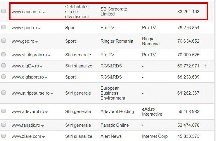 CANCAN.RO se află pe primul loc la numărul de AFIȘĂRI, reușind să surclaseze – după cum se poate observa mai sus – site-urile de televiziune, site-urile trusturilor multinaţionale, dar şi cele independente de ştiri.