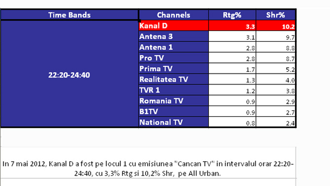 In intervalul orar 22.20- 00.40, emisiunea TV s-a clasat pe primul loc in clasamentul audientelor, pe targetul All Urban, depasind Antena 3, Antena 1 si Pro TV.