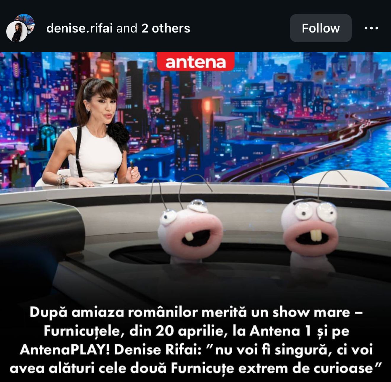 Denise Rifai s-a mutat la Antena 1 unde va apărea într-un nou format. Este vorba despre  emisiunea ”Furnicuțelor” – preluată și copiată din Spania (n.r „El Hormiguero”). Formatul combină interviuri cu celebrități, umor și experimente științifice spectaculoase. Nu este vorba despre un show clasic de umor, ci despre un show menit să-i țină pe telespectatori curioși și lipiți cu ochii de micile ecrane.