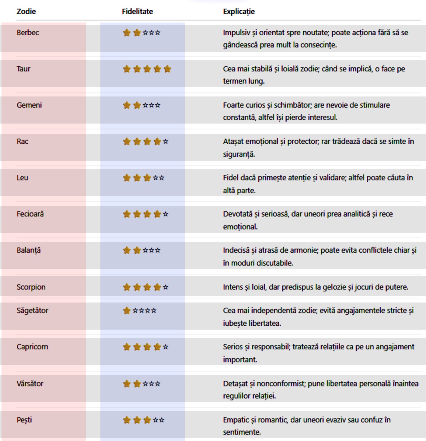 Zodiile în sine nu stabilesc fidelitatea și infidelitatea într-o relație, însă anumite trăsături generale ale lor pot influența modul în care o persoană se comportă. Pentru a vedea care este cea mai fidelă zodie, am analizat trăsăturile, calitățile și defectele caracteristice fiecărei zodii în parte. Pentru fiecare, am definit un coeficient de fidelitate, de la 1 stea (cea mai infidelă) la 5 stele (cea mai fidelă).